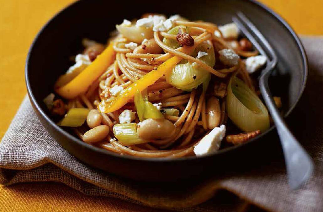 SPAGHETTI WITH SAUTÉED LEEKS, WHITE BEANS & WALNUTS