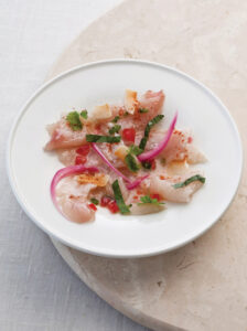 Thinly Slices hamachi Marinated Peruvian Style With Coconut Flakes