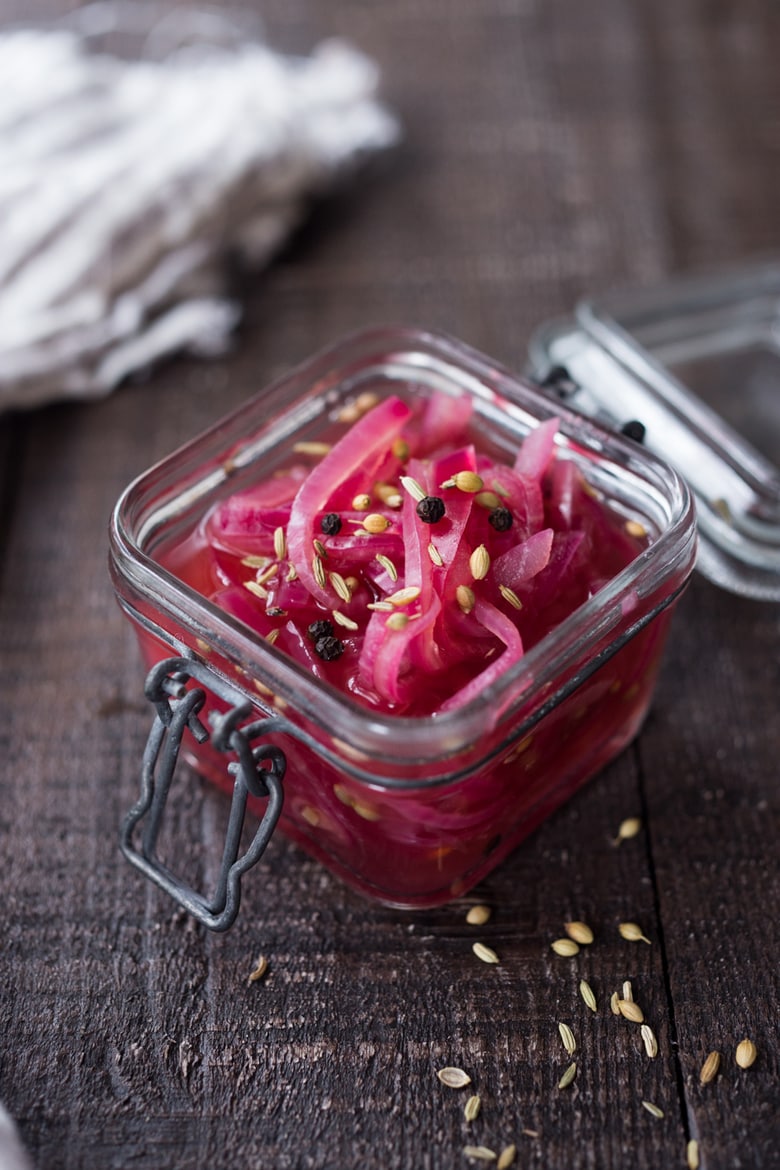 3. Arrange the onions in sterile pint jars, leaving at least ½ inch of headroom. Put ½ teaspoon of crushed red chills into each jar and cover the onions with the spiced vinegar. Seal the jars and put them aside for 1 month.