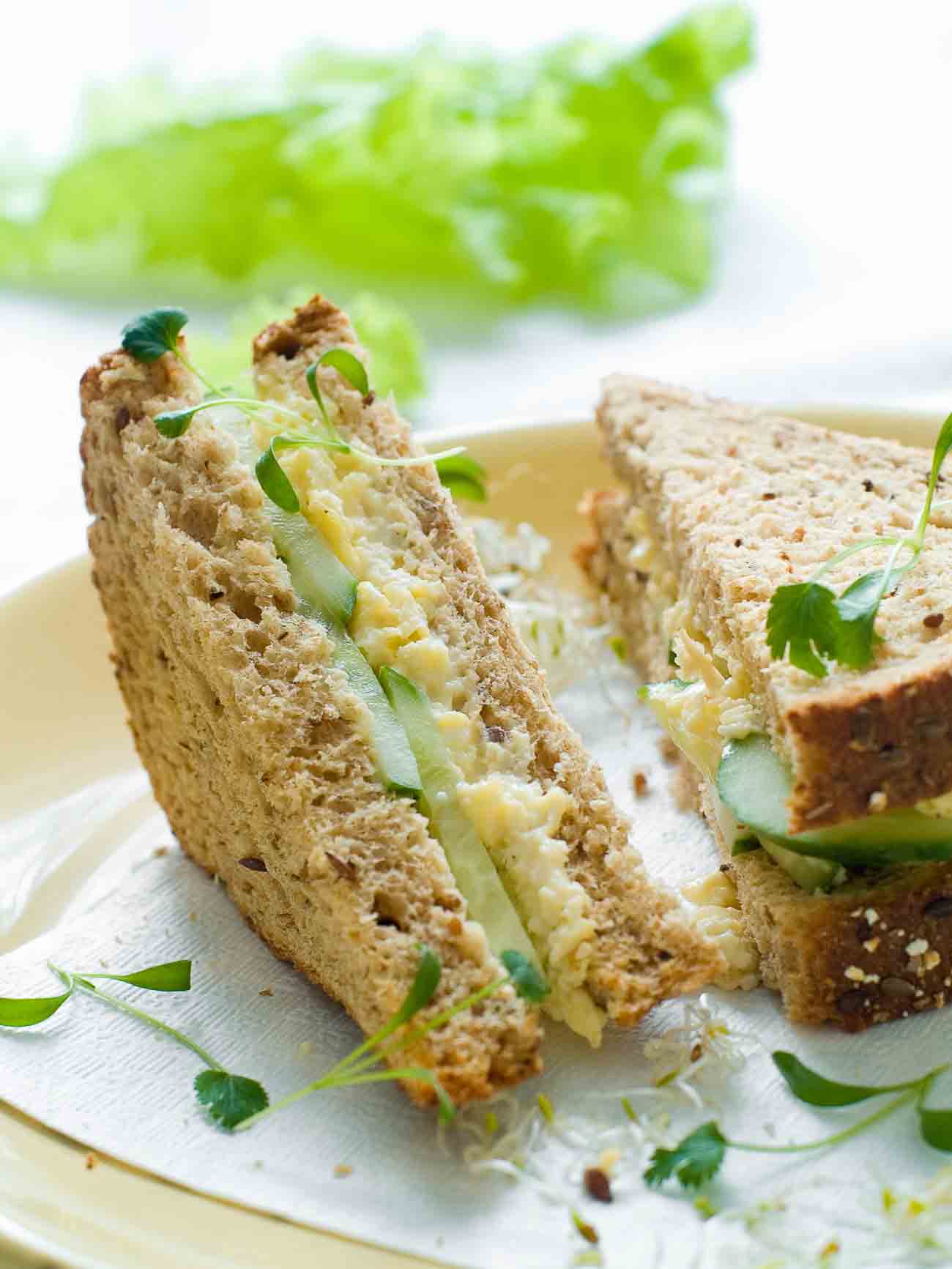 1. Cut square slices of pressed pumpernickel into quarters and butter them generously. Score a large, firm cucumber with a fork and slice it about ¼ inch thick. Put a cucumber slice in the center of each piece of bread. Peel some hard-boiled eggs and carefully slice them about ¼ inch thick as well. Using only the slices that have some of the yolk, center 1 slice of egg on each cucumber slice.