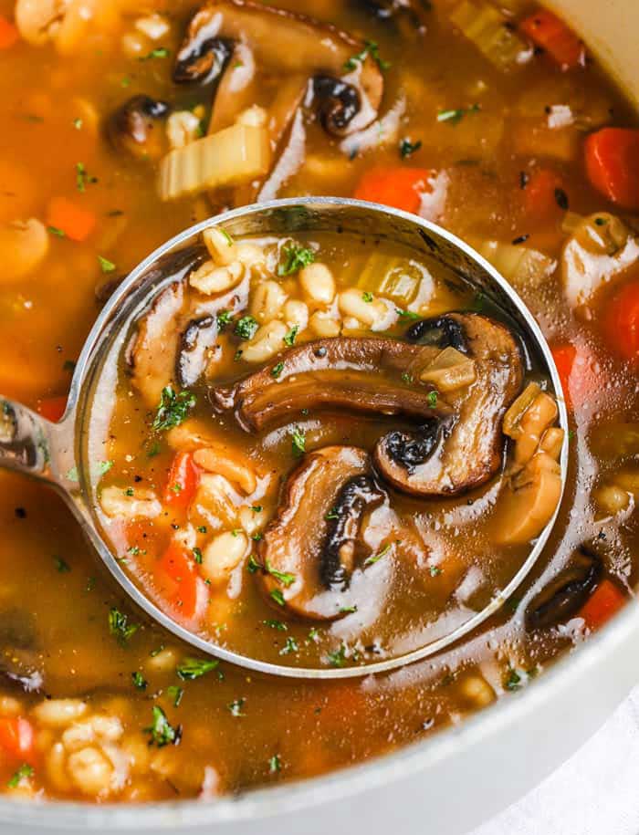 5. When the barley is tender, scoop the mushrooms and onions with a spatula into the soup.