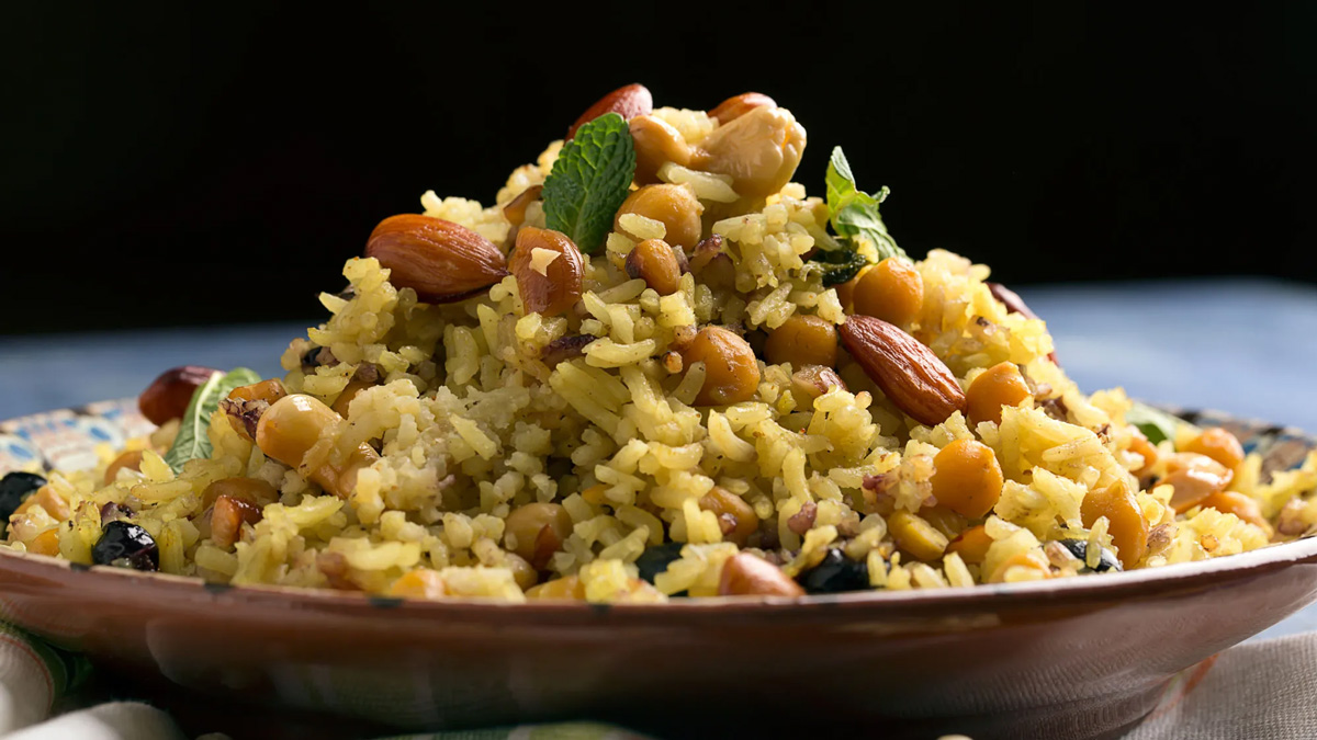 6. Turn the heat off and let the rice sit, covered, for 5 minutes to allow the fragile grains to firm up. Remove the cover and drop the fried almonds and potatoes into the rice. Fluff the rice and vegetables gently with a fork to mix evenly. Serve piping hot. An additional tablespoon (15 ml) of butter or ghee may be drizzled over the surface before serving. Garnish each serving with parsley or coriander.