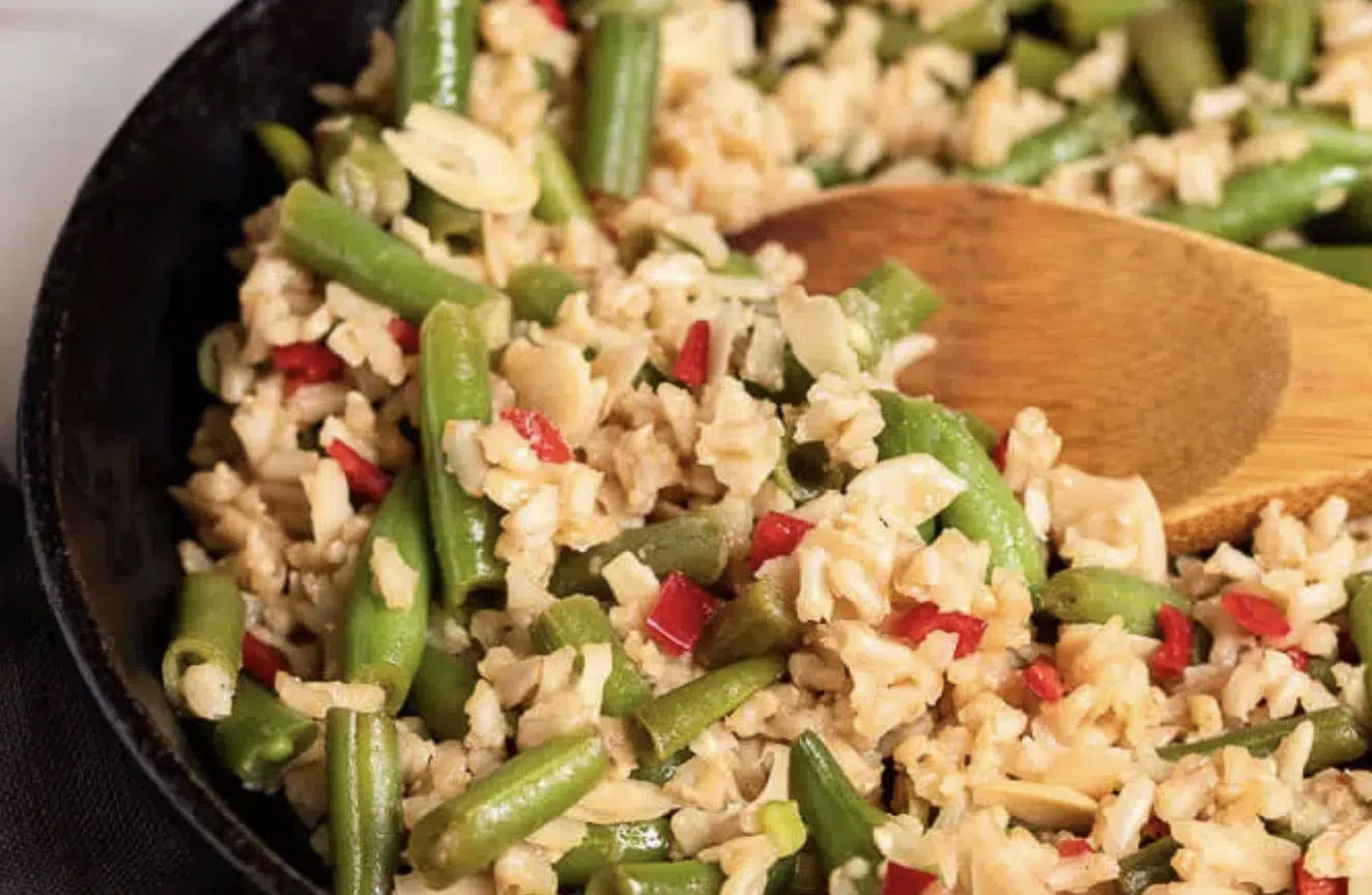3. Add the cumin and black mustard seeds and fry until the mustard seeds turn gray and sputter and pop. Stir in the green beans and rice and sauté for 3–4 minutes, partially cooking the beans and fully coating the rice.