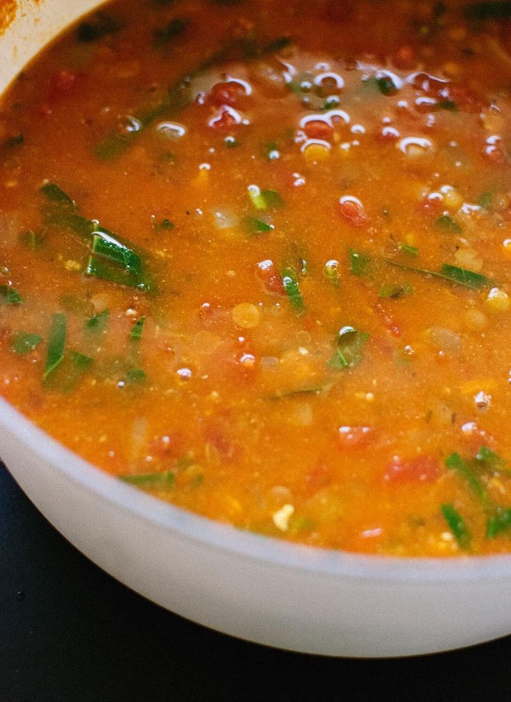 7. Bring the finished dal to a boil once more, turn off the heat and cover. Let the seasonings soak into the hot dal for 1–2 minutes. Add the minced herb, stir and serve.