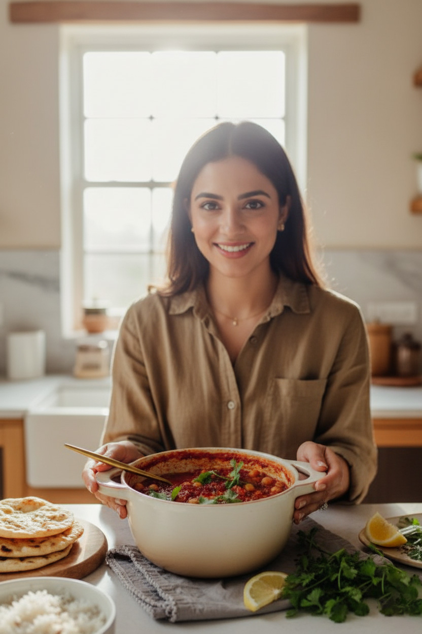 A buttery, spiced tomato glaze coats tender chickpeas in this delicious dried bean dish, ideal for a substantial warm breakfast or brunch with Griddle-Fried Whole Wheat Bread , seasonal fruits and a beverage.