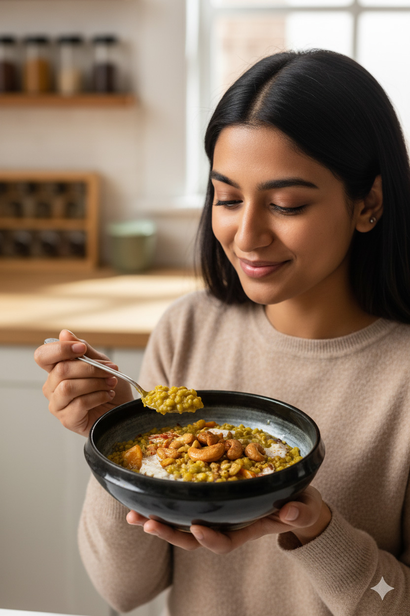 5. Heat the remaining ghee or oil-butter mixture in a small frying pan over low heat. Stir-fry the cashew bits until golden brown and fold them into the rice and dal stew. Garnish each serving with a pat of butter and a sprig of parsley.