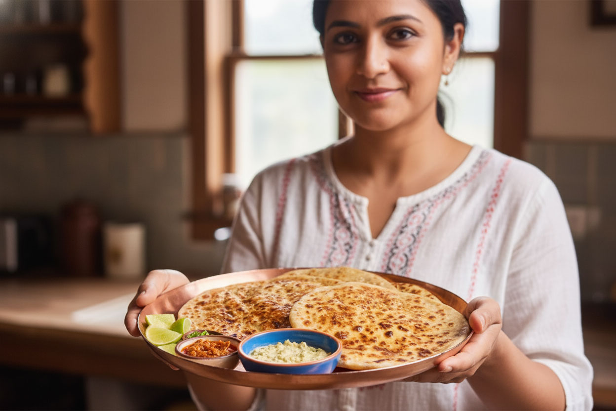 3. Carefully lift one stuffed paratha and lay it on the hot griddle.