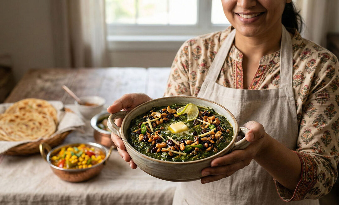 A woman in an apron smiling and holding a ceramic bowl of Buttery Spinach Sak topped with melted butter, fried cashews, and currants.