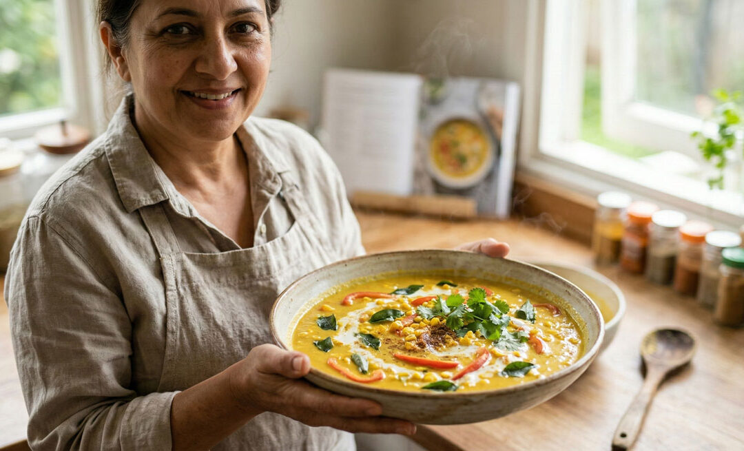 A comforting, realistic photograph of a smiling woman presenting a vibrant ceramic bowl of steaming Gujarati Makkai Shorba (corn and pepper soup).