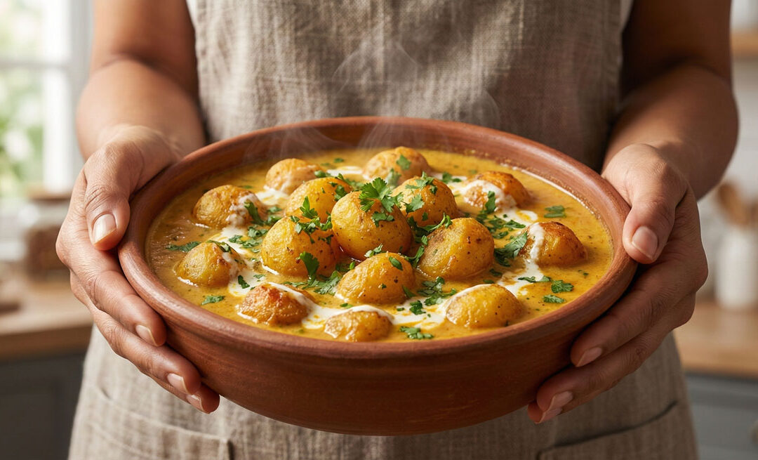 Woman holding a rustic clay bowl of Aloo Dum, featuring golden deep-fried baby potatoes in a creamy seasoned yogurt broth garnished with fresh coriander.