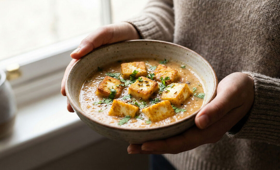 A close-up photograph of a bowl of Panir Maharani soup with fried panir cheese cubes, seasoned tomato stock, fresh cilantro, and cumin seeds, held in the hands of a person wearing a sweater.