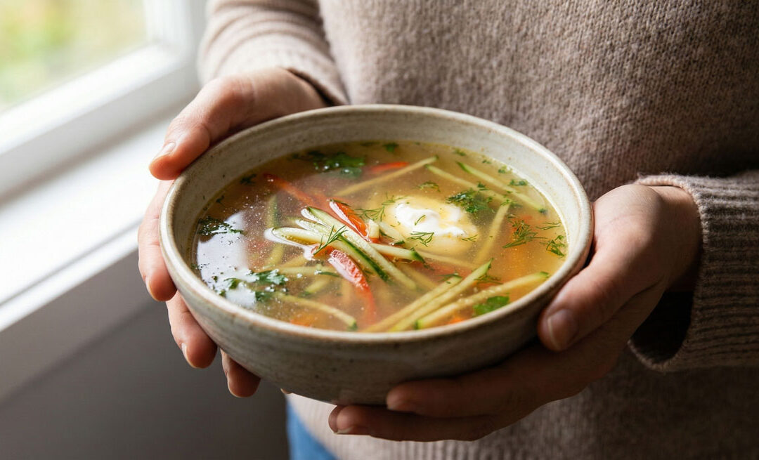 A woman holding a warm ceramic bowl of Gold Broth with Julienne Cucumbers KHEERASHORBA, featuring vibrant vegetable strips, fresh dill, and a dollop of sour cream.