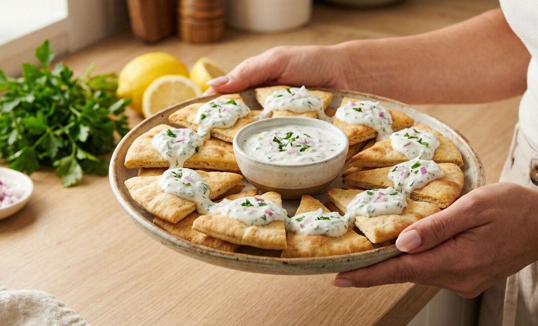 A woman holding a platter of golden, crispy Baked Pita Chips with Yogurt Dressing topped with red onions and fresh parsley in a bright kitchen.