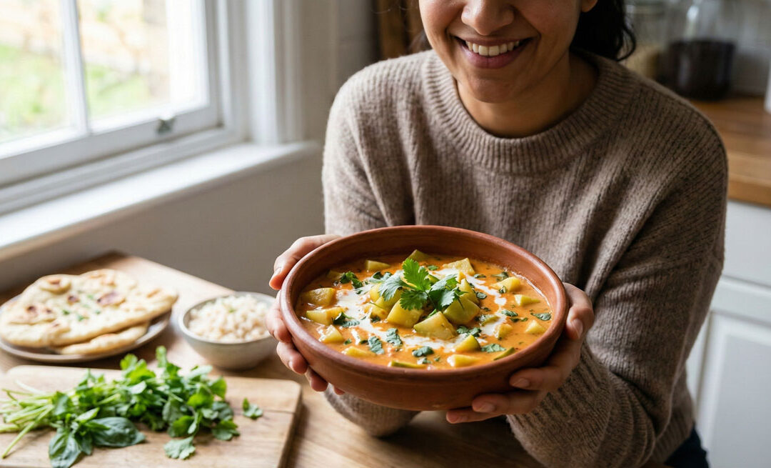 A woman holding a warm ceramic bowl of Louki Shorba (Zucchini Cubes in Light Tomato Broth) garnished with fresh coriander and basil, served in a bright, cozy kitchen.